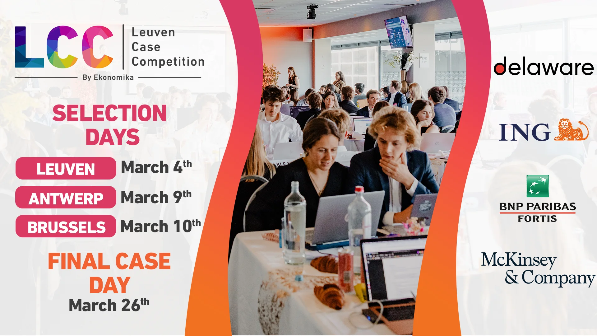 The Leuven Case Competition (LCC) by Ekonomika returns bigger, bolder, and more competitive than ever. As Flanders’ largest business game, LCC offers students from all backgrounds the opportunity to solve real-life challenges, pitch to top-tier professionals, and experience an unforgettable competition journey.